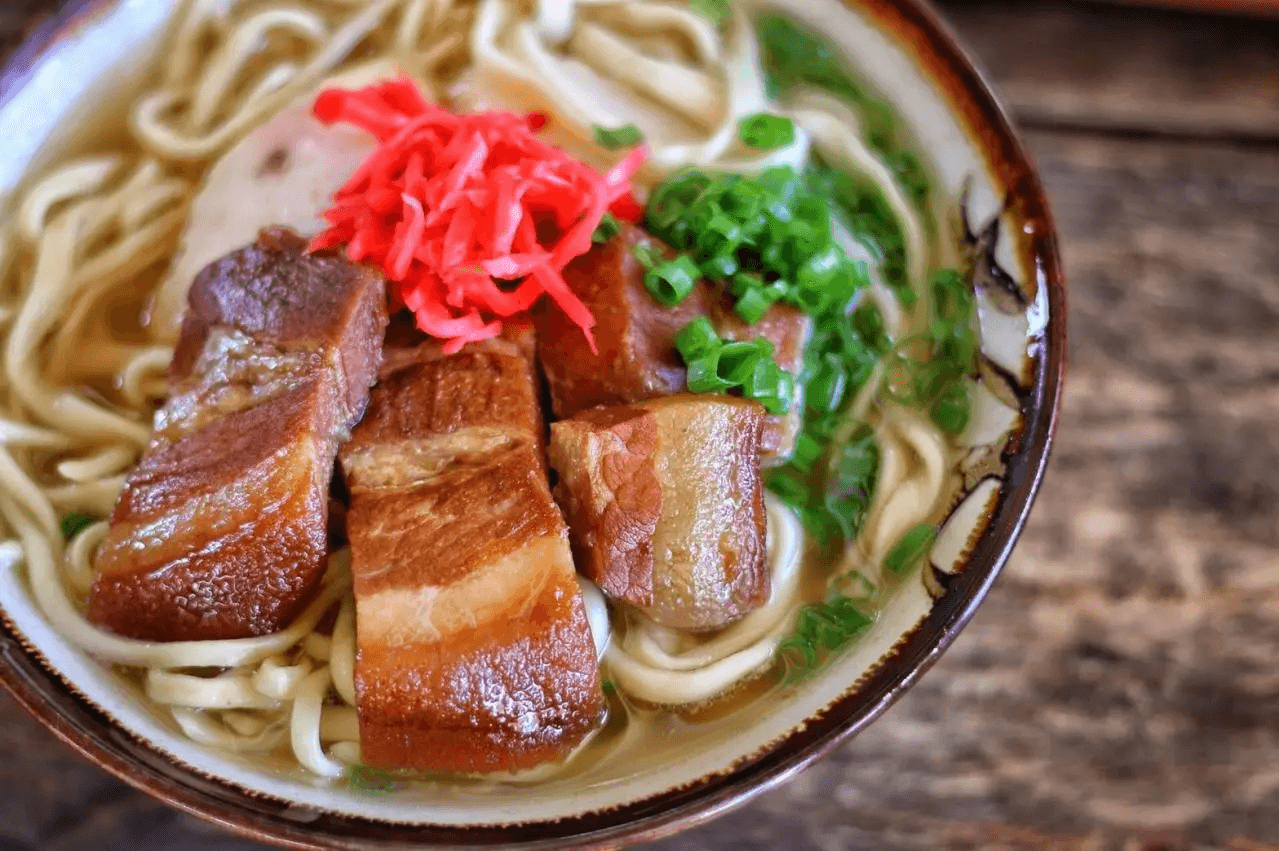 食べ物(たべもの)もとても美味(おい)しいです。沖縄そば(おきなわそば)は、太(ふと)い麺(めん)と豚肉(ぶたにく)のスープの料理(りょうり)です。